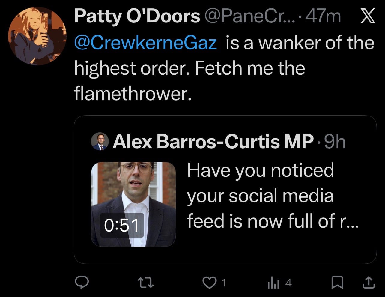 Or at least, that was the effect of it. At 7:14 in the morning, Labour MP Alex Barros-Curtis decided to post a video across his official social media channels about me, Joshua Bonehill-Paine, and about my work running the Crewkerne Gazette. It was an odd time for a moral panic, and an even odder time to attempt a doxxing. Odder still because he was too late: I had publicly identified myself more than a month earlier. The “unmasking” had already happened. The mystery had already gone. What remained, then, was not revelation but character assassination.